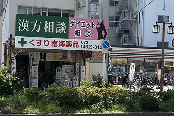 南海和歌山市駅から徒歩1分。一般医薬品、漢方薬、サプリメントを主に取り扱い。